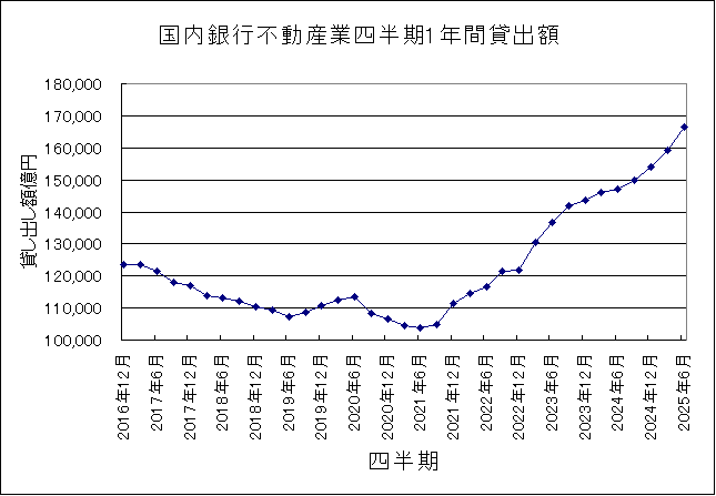 2907) 16.6兆円 国内銀行の不動産業貸出額過去最高 2025年第2四半期直近1年間