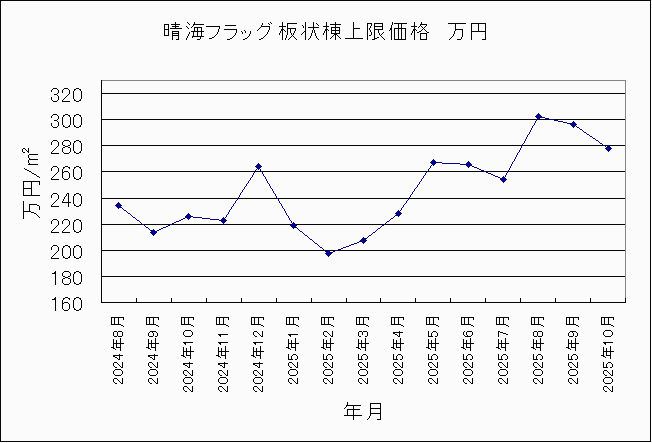 上限価格 変動率 2024年08月 234.27万円 - 2024年09月 213.97万円 −8.7% 2024年10月 225.66万円 +5.5% 2024年11月 222.59万円 -1.4% 2024年12月 264.01万円 +18.6% 2025年01月 218.82万円 −17.1% 2025年02月 197.54万円 −9.7% 2025年03月 207.19万円 +4.9% 2025年04月 228.16万円 +10.1% 2025年05月 266.87万円 +17.0% 2025年06月 266.02万円 -0.3% 2025年07月 254.36万円 -4.4% 2025年08月 302.07万円 +18.8% 2025年09月 296.47万円 -1.9% 2025年10月 277.63万円 -6.4%
