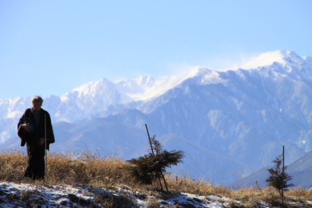 白い雪が頂きを覆う木曽山脈をバックに、田中泯扮する井月が、一人丘の上に立つ姿のスチール写真である。